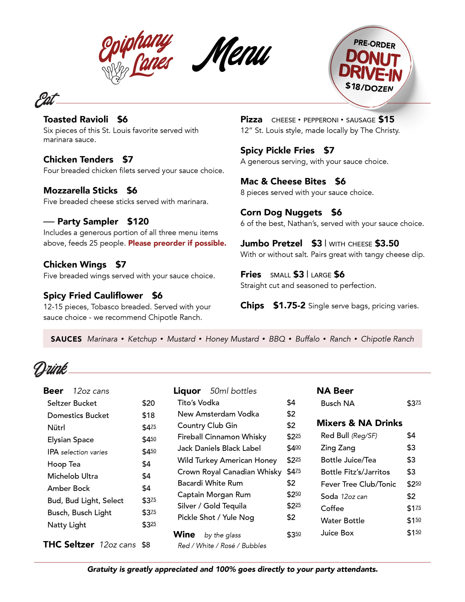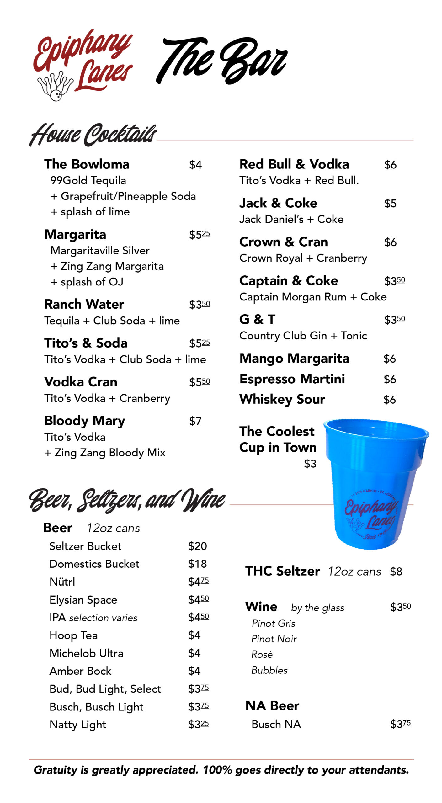 We strive to provide the best service to our guests. Occasionally there is a mechanical breakdown on lane(s) or other unexpected circumstance (such as inclement weather) that causes changes to your reservation. Epiphany Lanes reserves the right to alter the number of lanes available, or to alter the time/date of your event.